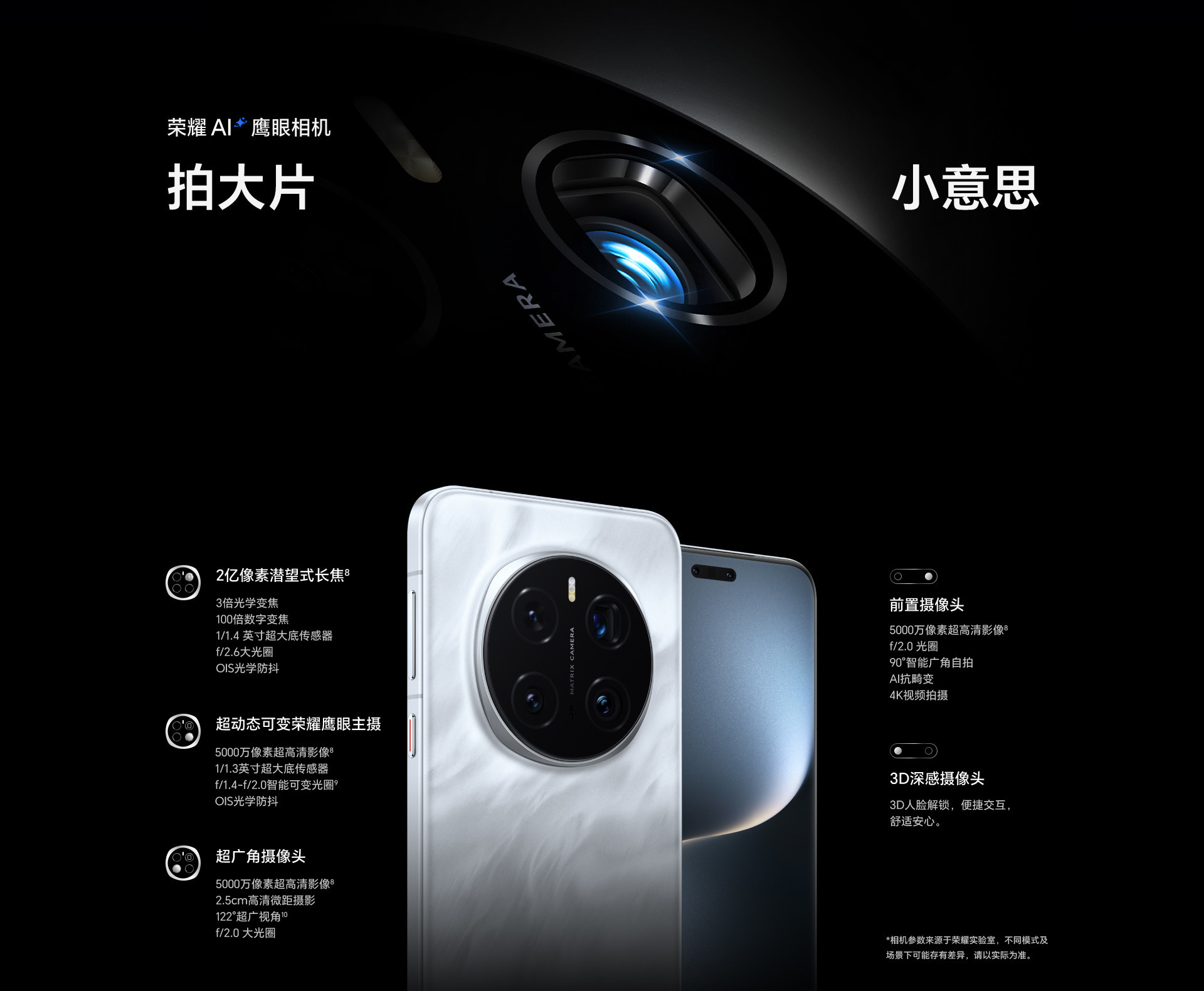荣耀Magic7 Pro影像主打真实还原,其2亿像素超清潜望式长焦镜头支持3倍光学变焦与100倍数字变焦;主摄采用5000万像素镜头,搭配f/1.4-f/2.0可变光圈,可自动调节光圈大小,强光下避免过曝,弱光下提升亮度;超广角同样采用5000万像素镜头,拥有122°视野、2.5cm微距,拍风景无畸变,拍花朵可聚焦花瓣纹理。此外,自研鹰眼相机系统可实现0.48秒极速抓拍,还支持鹰眼超级连拍、舞台模式、主角追焦、多镜录像、AI摄影等功能。