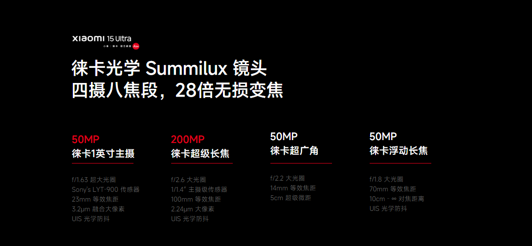 小米15 Ultra通过特色功能将徕卡光学基因与高像素实力深度融合。该机后置四摄模组,其2亿像素潜望长焦采用三星HP9传感器,1/1.4英寸大底搭配高折射率微透镜技术,感光度较上代提升12%,自动对焦精度提高10%,支持120×数字变焦;主摄采用5000万像素1英寸索尼LYT-900传感器,搭配f/1.63大光圈与OIS光学防抖,进光量充足;超广角镜头为5000万像素三星JN5传感器,视野达115°;浮动长焦镜头为5000万像素,支持3×光学变焦(等效70mm)。